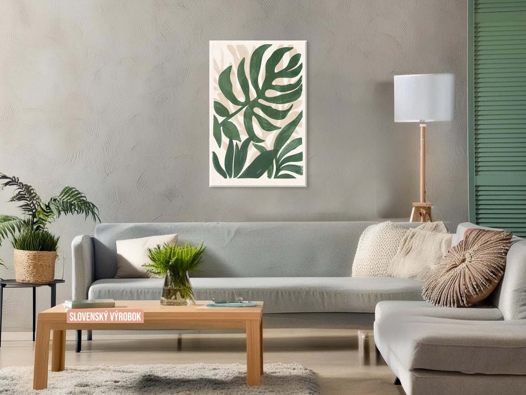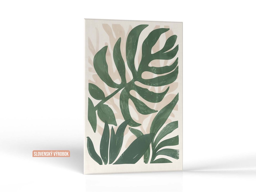 Obraz zobrazuje výrazné tropické listy v tmavozelenej farbe, ktoré sú kontrastne umiestnené na jemne textúrovanom svetlom pozadí. Listy sú veľké a majú výrazné rezy, čo im dodáva dynamický a exotický vzhľad. Kompozícia obrazu je elegantná a vytvára pocit prírodnej krásy a pokoja, ideálny pre osvieženie interiéru.