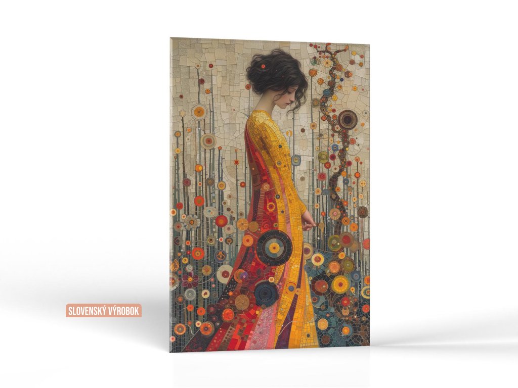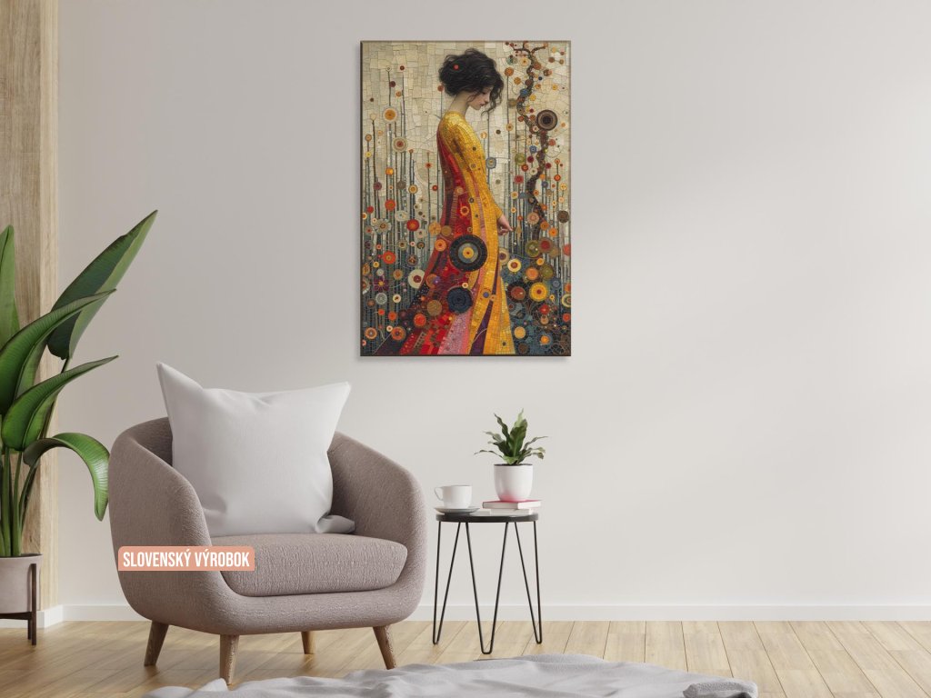 Obraz zobrazuje profil ženy s tmavými vlnitými vlasmi a šatmi, ktoré sú zobrazené ako pestrofarebný mozaikový patchwork. Pozadie a šaty sú plné geometrických a kruhových vzorov, ktoré pripomínajú štýl moderného umenia. Dominantnou farbou je zlato a teplé odtiene, ktoré vytvárajú pocit hĺbky a textúry.