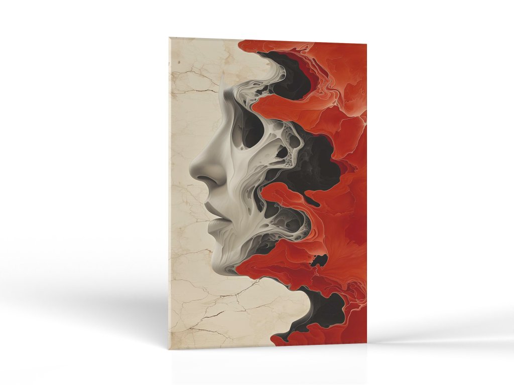 Abstraktná kompozícia pripomínajúca ľudskú tvár v červeno-čiernom gradiente.