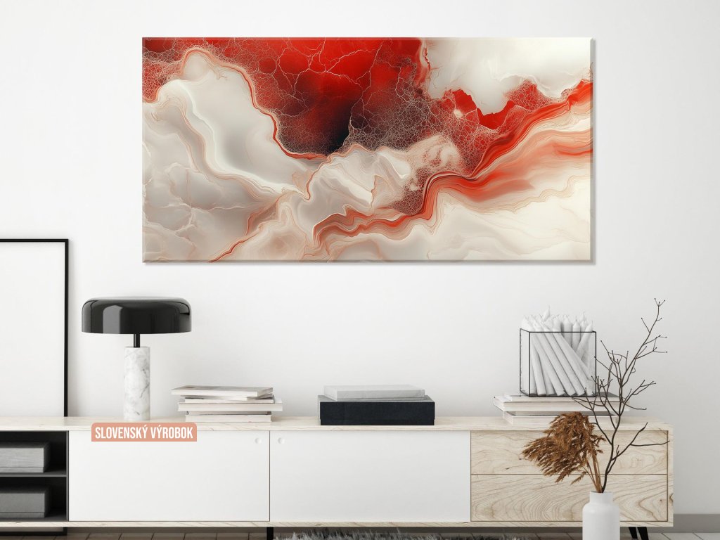 Tento obraz je fascinujúcou hrou červených a béžových odtieňov, ktoré vytvárajú dojem pulzujúcej krajiny alebo mikroskopického pohľadu na živé tkanivo. Jemné línie a praskliny vytvárajú vizuálne napätie medzi tekutými a pevnými formami. Celkový efekt je dynamický a zároveň introspektívny, evokujúci spojenie medzi prírodou a ľudským telom.