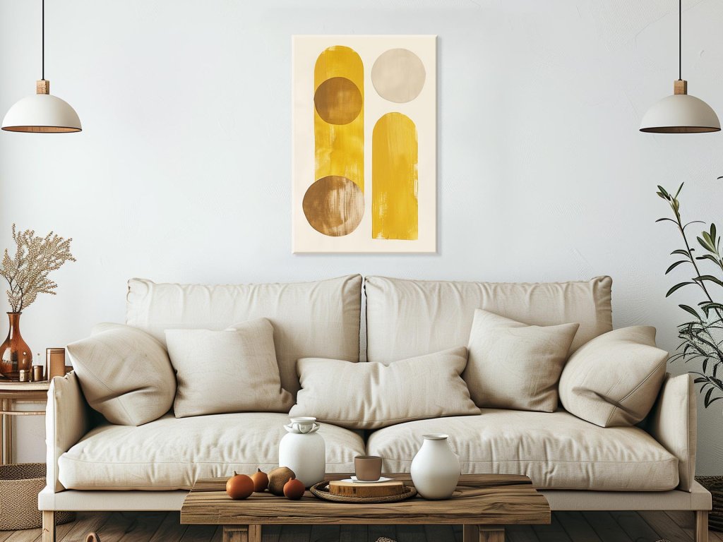 Tento obraz predstavuje minimalistickú abstraktnú kompozíciu, kde sú žlté a zlaté kruhy a obdĺžniky usporiadané na svetlom pozadí. Farby sú jasné a teplé, čo vytvára pocit radosti a svetla. Jednoduché tvary a čisté línie pridávajú obrazu moderný a elegantný vzhľad, pričom celková kompozícia pôsobí harmonicky a vyvážene.
