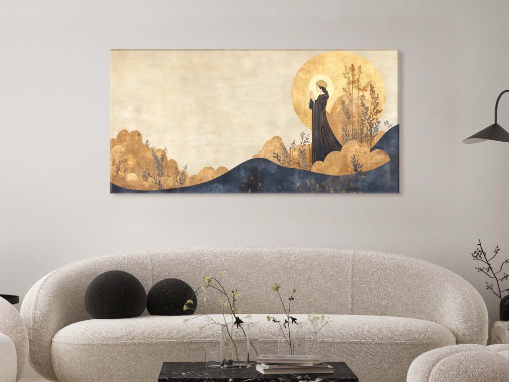 Obraz zobrazuje vysokú postavu v tmavom rúchu, ktorá kráča so zopnutými rukami cez pokojný kraj zaplavený zlatou žiarou. Jej svätožiara a veniec na hlave naznačujú duchovnú čistotu a spojenie s vyšším princípom. Kompozícia s jemnými tvarmi kopcov, rastlín a tichou siluetou vytvára atmosféru pokory, meditácie a vnútorného mieru.