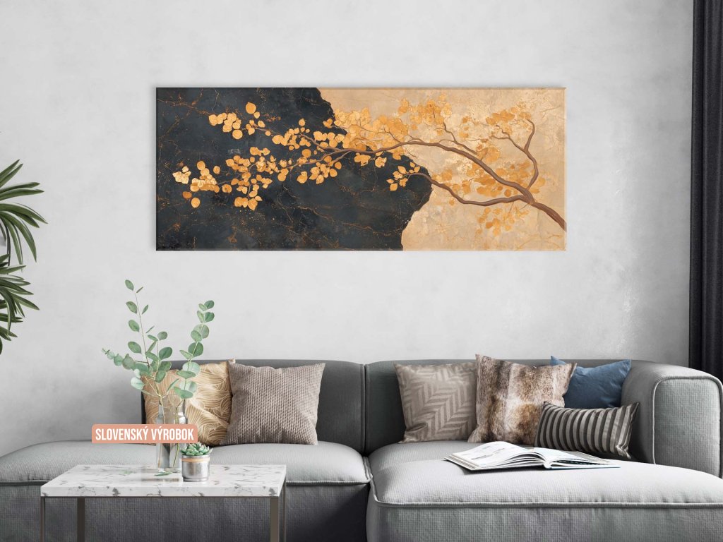 Obraz zobrazuje jemnú vetvu pokrytú zlatými listami, ktorá sa rozprestiera na kontrastnom mramorovom podklade v tmavých a svetlých odtieňoch. Zlaté detaily do kompozície luxusný a sofistikovaný nádych, pričom zvýrazňujú krásu a krehkosť prírody. Táto minimalistická harmónia farieb a textúr evokuje pocit nadčasovosti a elegancie.