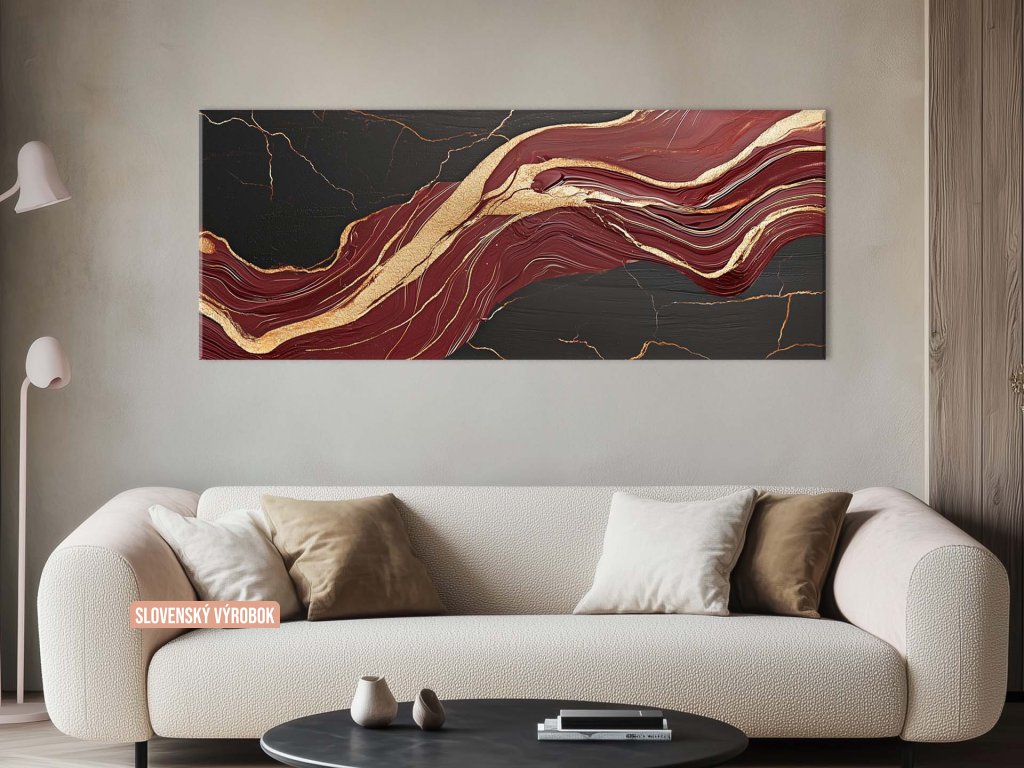 Tento obraz zobrazuje silný kontrast medzi tmavou čiernou plochou a bohatými odtieňmi červenej, ktoré sú pretkané jemnou zlatou líniou. Zlato v strede obrazu pôsobí ako žila, ktorá oživuje celé dielo a dodáva mu luxusný a dramatický nádych. Hra farieb a textúr vytvára hlboký dojem s výrazným pocitom pohybu a elegancie.