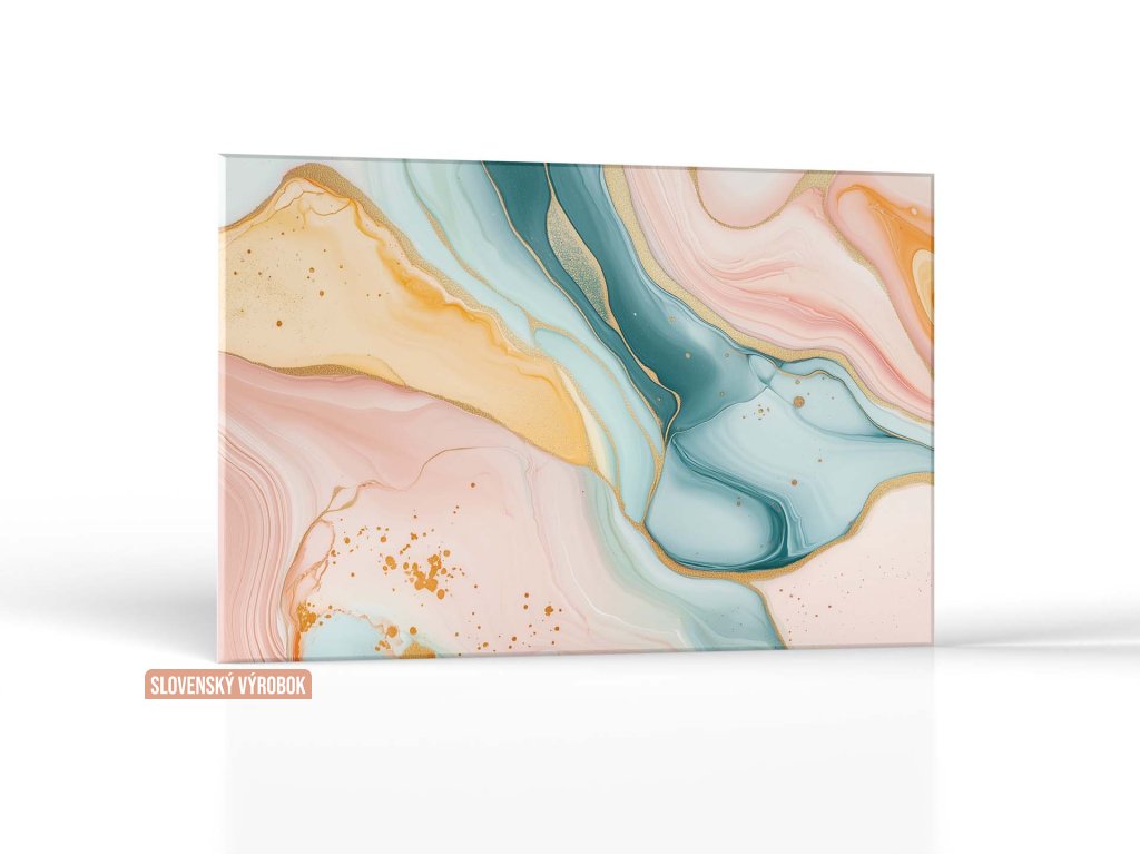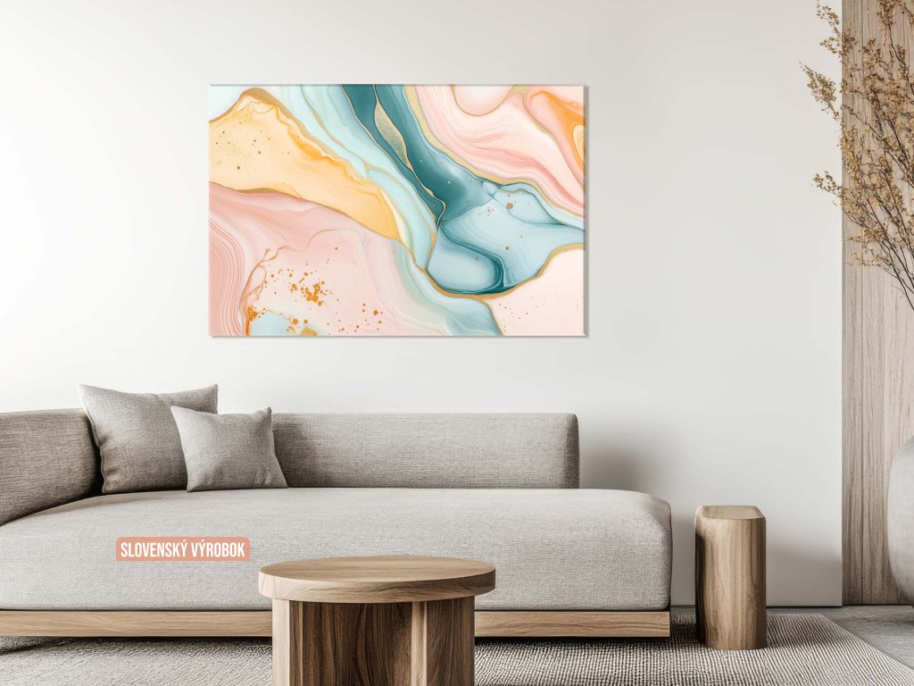 Obraz zachytáva elegantnú kombináciu jemných pastelových odtieňov ružovej, modrej a zlatej, ktoré splývajú do harmonických vlnitých foriem. Zlatožlté línie a detaily dodávajú kompozíciu luxusný a sofistikovaný vzhľad. Celkové vyžarovanie diela je pokojné a vyvážené, ideálne na dotvorenie moderného interiéru.