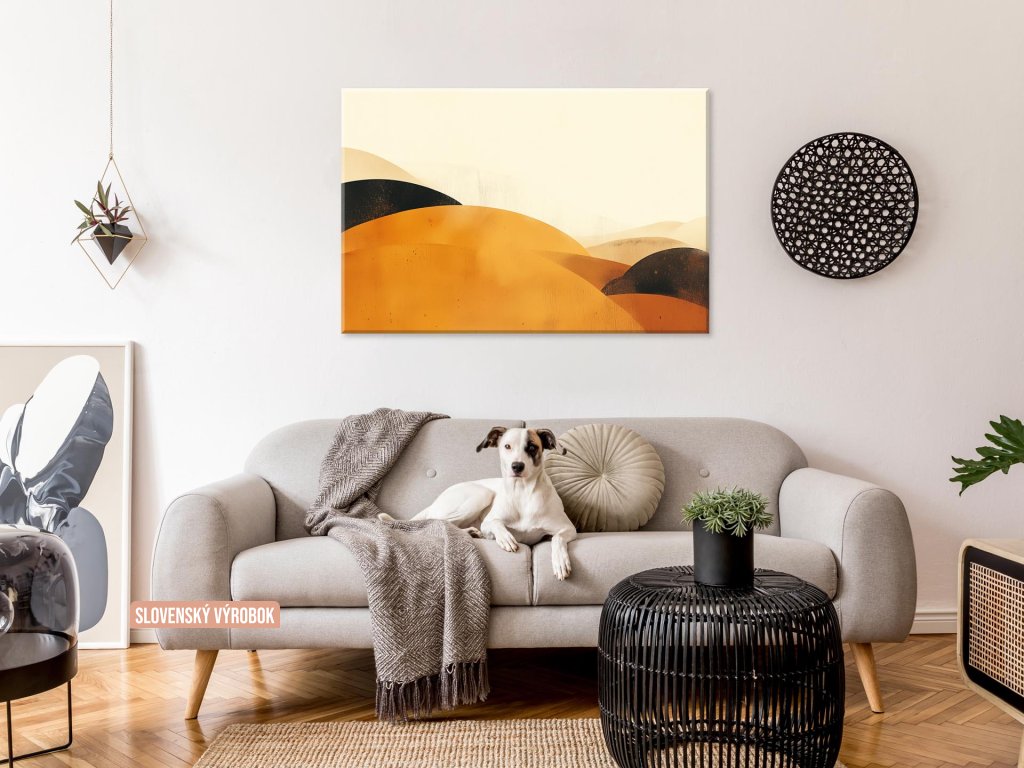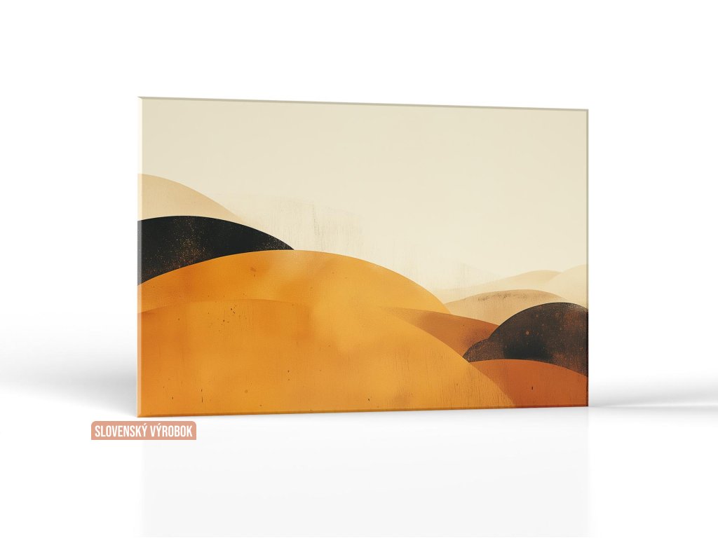 Tento obraz zachytáva jemnú krásu abstraktnej krajiny, kde dominujú zlaté a hnedé tóny vytvárajúce jemné krivky kopcov. Tóny a textúry sú jemne prechádzajúce, čím vzniká dojem hĺbky a priestoru, zatiaľ čo jednoduché farebné palety pridávajú obrazu eleganciu a pokoj. Celková kompozícia vyvoláva pocit tepla a pokoja, pričom umožňuje divákovi ponoriť sa do pokojnej a harmonickej atmosféry tejto imaginárnej krajiny.