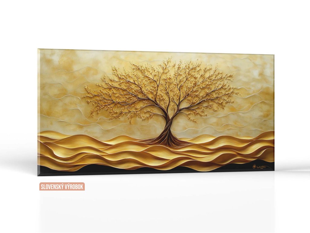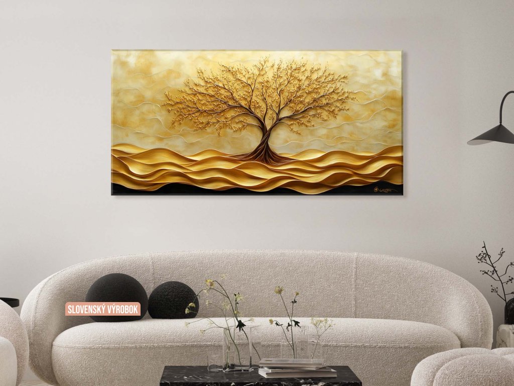 Tento obraz zobrazuje silný a vyvážený strom, ktorého vetvy a listy pôsobia ako zliate zo zlata a vyžarujú pokoj a dôstojnosť. Vlnitý zlatistý podklad evokuje krajinu snov, kde sa prelína prirodzená elegancia s abstraktnou krásou. Kompozícia je harmonická a vyvoláva pocit nadčasovej rovnováhy medzi pevnosťou koreňov a jemnosťou vetiev.