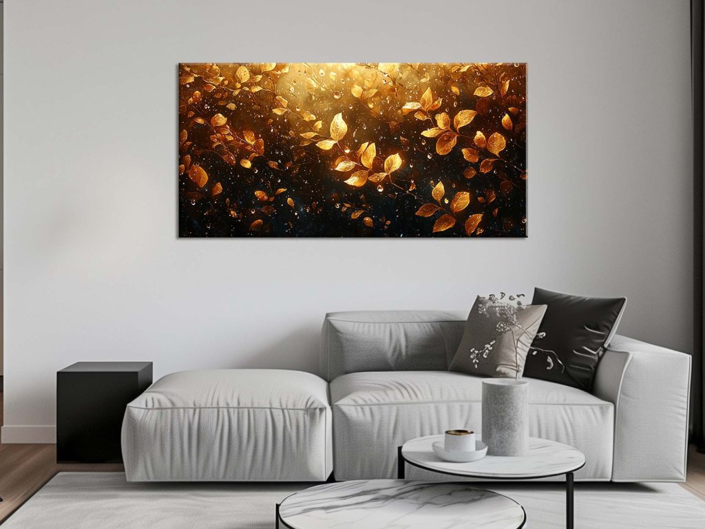 Tento obraz zobrazuje nádhernú prírodnú scenériu, kde zlaté listy v kontraste s tmavým pozadím vytvárajú pocit tepla a lesku. Drobné kvapky dažďa, ktoré sa jemne zachytávajú na listoch, dodávajú obrazu hĺbku a dynamiku. Atmosféra obrazu pripomína pokojný jesenný večer, kde sa príroda kúpe vo svetle zapadajúceho slnka.