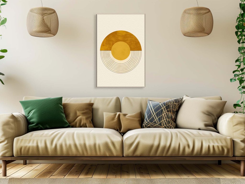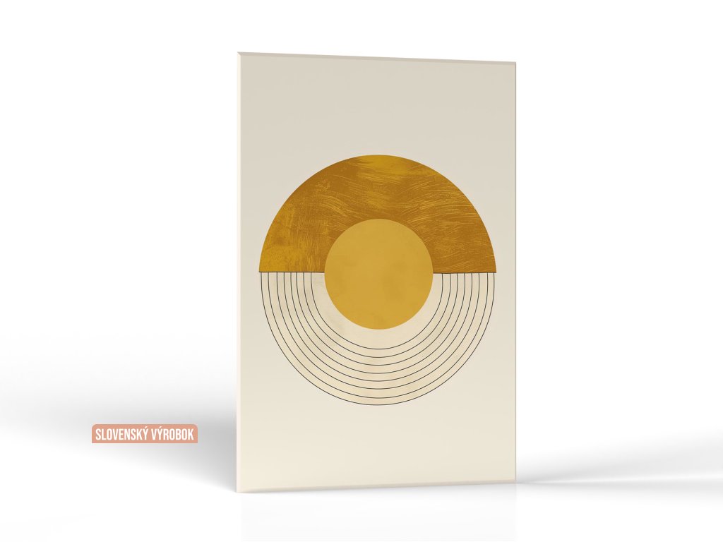 Tento obraz ponúka zobrazenie polkruhového zlatého slnka umiestneného nad sériou koncentrických kruhov, ktoré pripomínajú vlny. Použité farby sú teplé odlesky zlata a hnedožlté tóny na krémovom pozadí, čo dodáva dielu pocit pokoja a jednoduchosti. Štruktúra a vzory na slnku dodávajú dielu hĺbku a textúru.