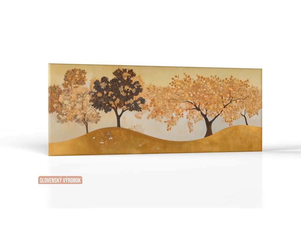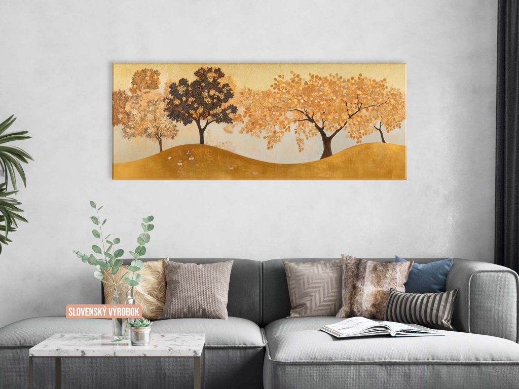 Obraz zachytáva krajinu s viacerými stromami v teplých odtieňoch zlatej, hnedej a béžovej, ktoré kontrastujú s jemným pozadím. Každý strom symbolizuje rôzne obdobia života a krásu prírody v jej rozmanitosti. Zlato na povrchu dodáva obrazu majestátnosť a vytvára pocit nadčasovej harmónie a elegancie.