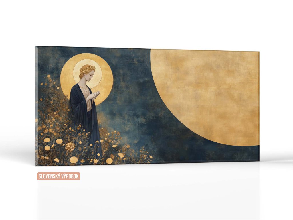 Obraz zobrazuje ženu v tmavomodrom rúchu, ktorá so sklopeným zrakom drží ruky v pokornom geste, obklopená zlatistými kvetmi. Za ňou žiari veľká svätožiara a oproti nej dominuje kompozícii obrovský zlatý kruh, symbolizujúci duchovné svetlo alebo večnosť. Atmosféra diela je hlboko kontemplatívna, vyžaruje pokoj, pokoru a svätosť v spojení s prírodou.