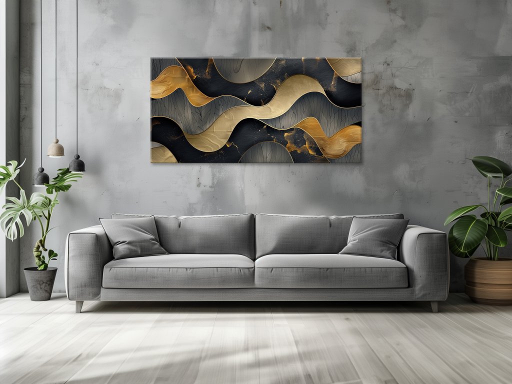 Tento obraz zachytáva elegantnú abstraktnú kompozíciu, kde sa zlaté a sivé vlny prelínajú a vytvárajú zaujímavé vizuálne efekty. Každá vlna je detailne textúrovaná, čo dodáva obrazu hĺbku a dynamiku. Zlaté odlesky v kombinácii so sivými tónmi vytvárajú luxusný a harmonický vzhľad, ktorý priťahuje pozornosť a evokuje pocit pokoja a sofistikovanosti.