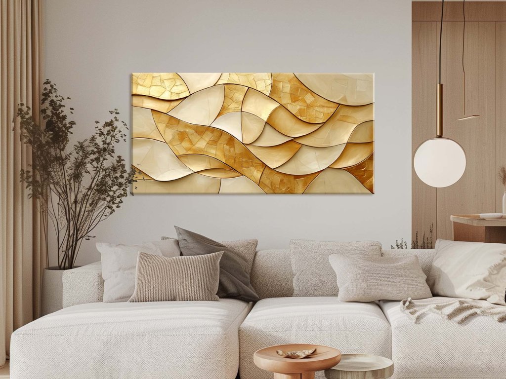 Obraz zobrazuje jemné, plynulé vlny v kombinácii zlatých a krémových odtieňov, ktoré pôsobia ako moderné umelecké dielo. Zlato zdôrazňuje bohatstvo a eleganciu, zatiaľ čo krémové plochy dodávajú dielu jemnosť. Hra svetla a tieňov na týchto vlnách vytvára dojem hĺbky a trojrozmernosti, čo obrazu dodáva výrazný vizuálny efekt.