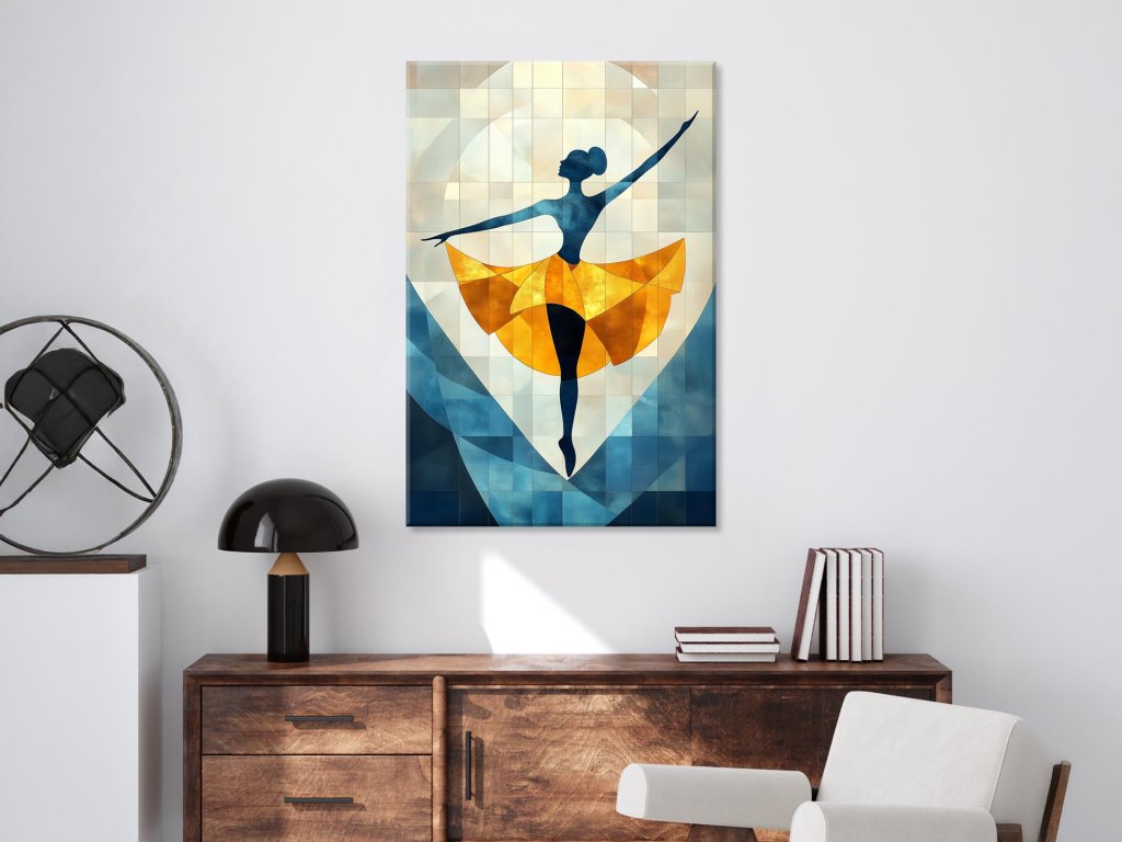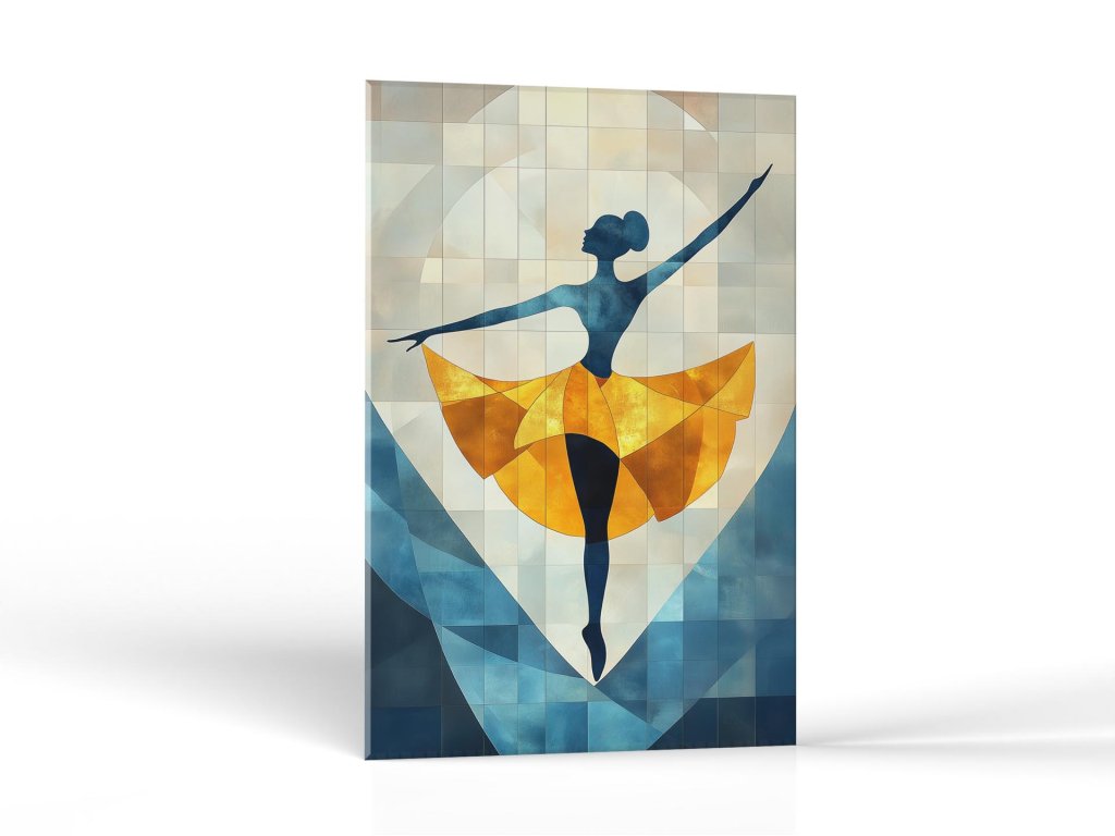 Obraz zobrazuje elegantnú postavu baletky v dramatickej póze, jej zlatá sukňa žiari na pozadí tónovaných modrých a béžových geometrických tvarov. Kompozícia vytvára ilúziu pohybu a svetla, pričom kombinácia studených a teplých farieb dodáva obrazu harmóniu a energiu. Tanečnica, hoci len silueta, pôsobí živým dojmom a vťahuje diváka do poetickej hry tvarov a emócií.