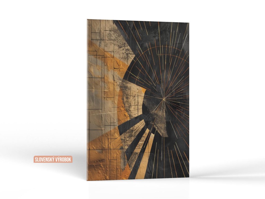 Tento obraz zachytáva dynamickú kompozíciu zlatých a čiernych línií, ktoré vychádzajú z centra v tvare explózie. Textúrované pozadie dodáva obrazu hĺbku a komplexnosť, pričom kontrast medzi zlatými a tmavými tónmi vytvára vizuálny záujem a dramatický efekt. Celková kompozícia evokuje pocit energie a pohybu, pričom kombinácia línií a textúr pridáva obrazu sofistikovaný a moderný vzhľad.
