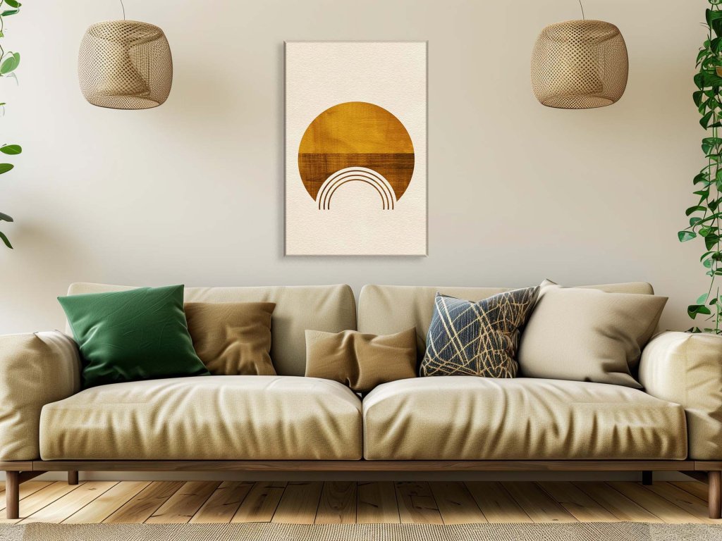 Tento obraz predstavuje abstraktnú krajinu s polkruhom na hornej časti, ktorý pripomína západ slnka, nadradený nad troma hnedými oblúkmi, symbolizujúcimi zem. Je to jednoduché, ale výrazné umelecké dielo, ktoré kombinuje geometrické prvky s teplými zemitými farbami a dotykmi textúry, čo vyvoláva pocit pokoja a harmónie.