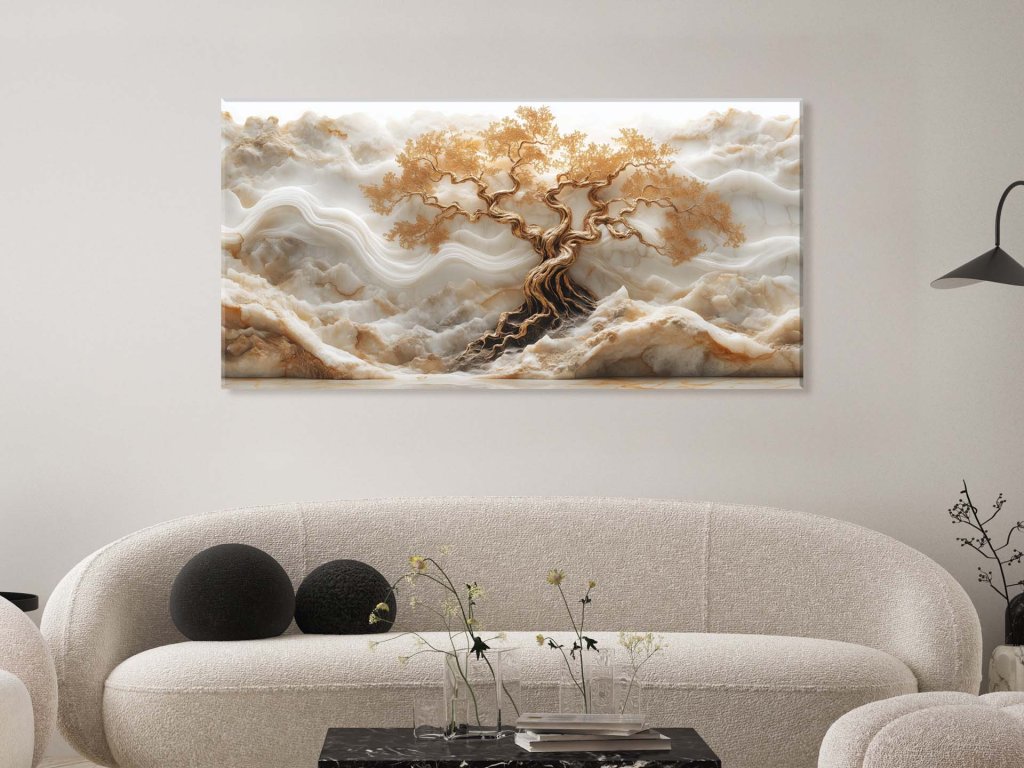 Obraz zachytáva majestátny strom so zlatými konármi a koreňmi, ktoré sa rozprestierajú na zvlnenom podklade pripomínajúcom mramor. Vzory krajiny pripomínajú vrstvenie hornín, no zároveň vyžarujú jemnosť a eleganciu. Celková kompozícia pôsobí nadpozemsky, harmonicky spájajúc silu prírody s estetickou krásou.