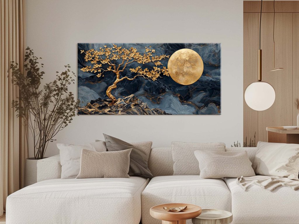 Na obraze vidíme zlatý strom, ktorý sa tiahne z drsných skál, pričom jeho vetvy sa jemne dotýkajú mesiaca. Kontrast tmavého pozadia a zlatých prvkov vytvára mystický a nadčasový efekt. Obraz symbolizuje harmóniu medzi prírodou a kozmickými silami.