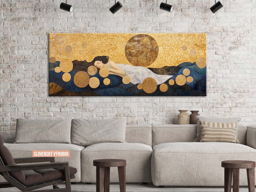 Obraz zobrazuje ženu v bielych šatách pokojne oddychujúcu na modrých vlnách, obklopených zlatými kruhmi a žiariacim pozadím. Bohaté ornamentálne detaily a teplé zlaté tóny vytvárajú snovú, mystickú atmosféru pripomínajúcu štýl art nouveau. Kombinácia kontrastných farieb a jemných tvarov odráža harmóniu medzi pokojom spánku a žiarou nekonečnej fantázie.