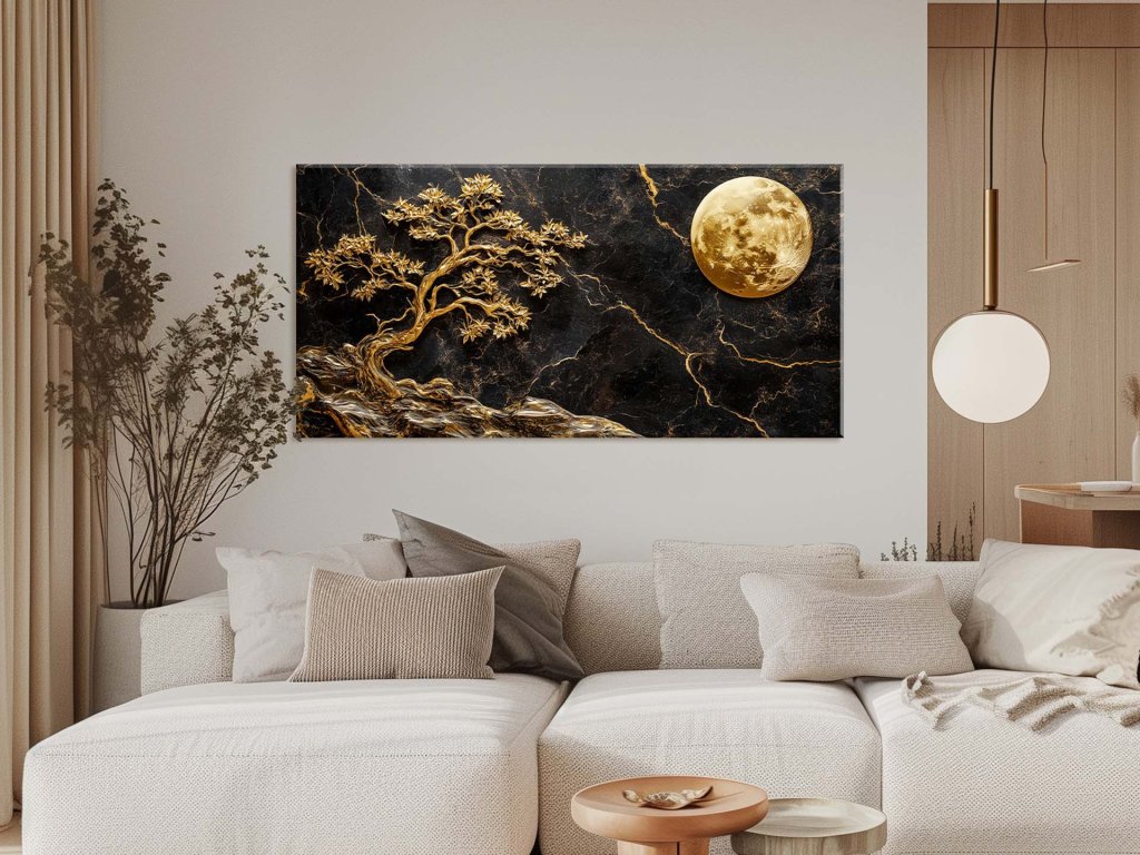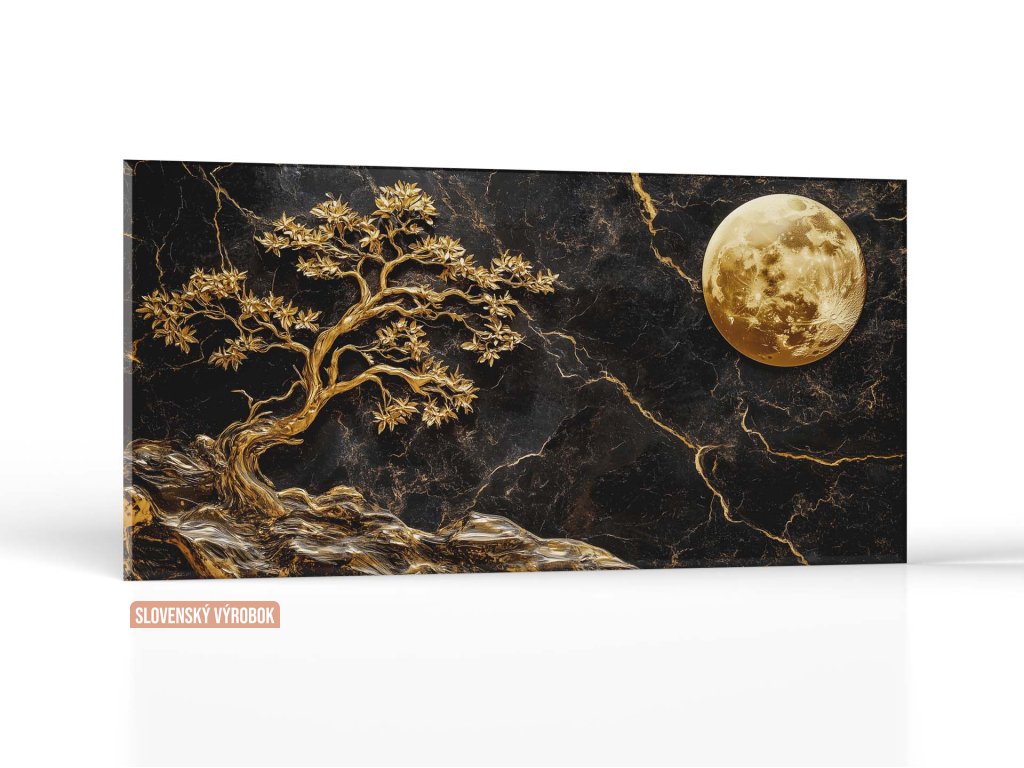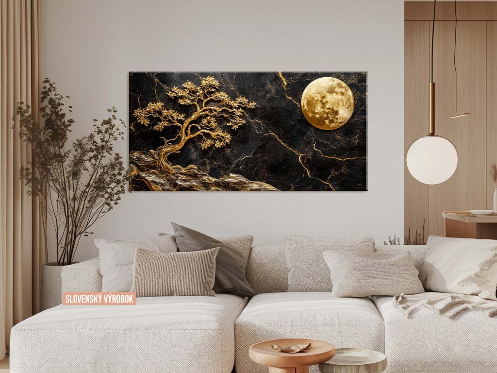 Tento obraz predstavuje nádherný kontrast medzi tmavým, mramorovým pozadím a žiarivými zlatými detailmi stromu a mesiaca. Každá vetva stromu je prepracovaná do najmenšieho detailu, čo vytvára dojem bohatstva a elegancie. Zlatý mesiac zavesený na oblohe dodáva obrazu majestátnosť a pokoj, čím vytvára harmonickú scenériu.