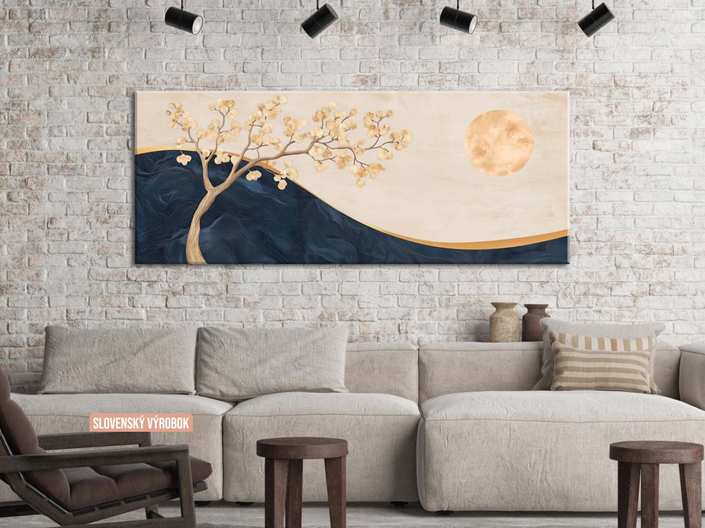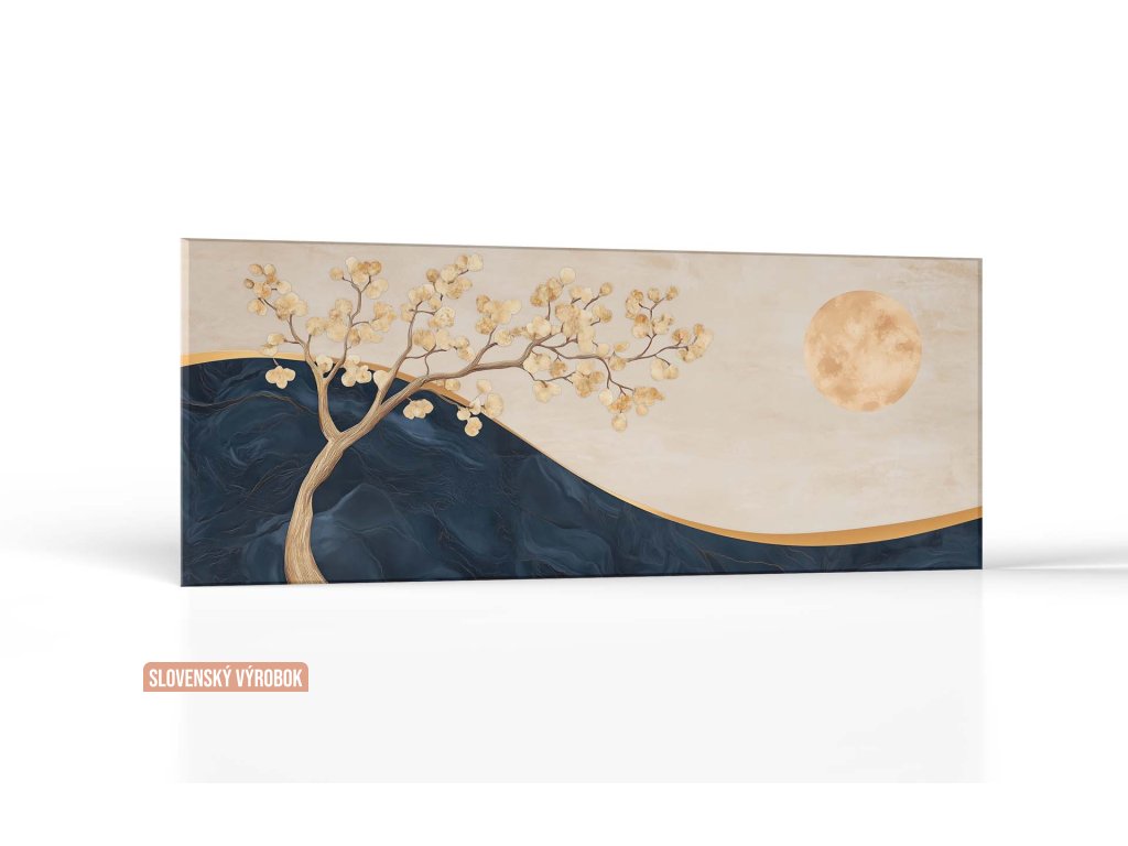 Obraz zobrazuje jemný strom s rozvetvenými konármi a zlatistými lístkami, ktoré vynikajú na abstraktnom tmavomodrom a béžovom pozadí. Dominantným prvkom je veľký zlatistý mesiac, ktorý vytvára harmóniu medzi prírodnými prvkami a nebeským prostredím. Táto minimalistická a esteticky vyvážená kompozícia evokuje pokoj, eleganciu a nadčasovú krásu prírody.