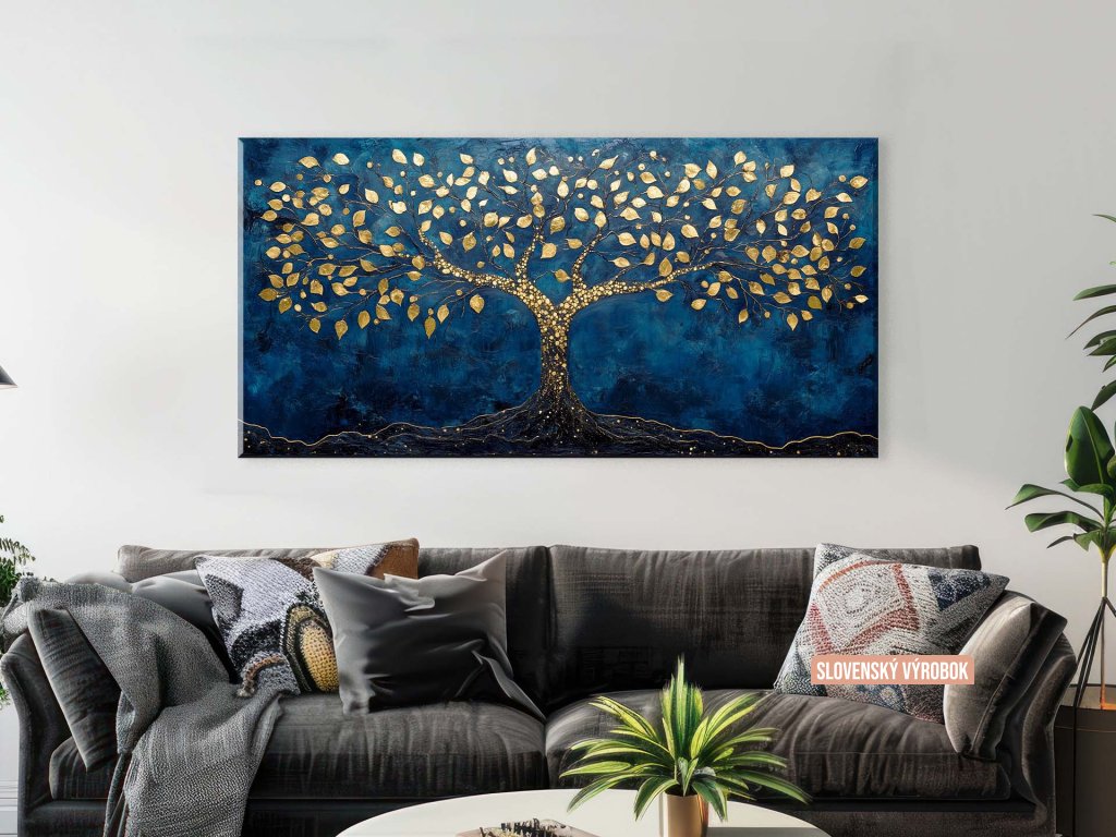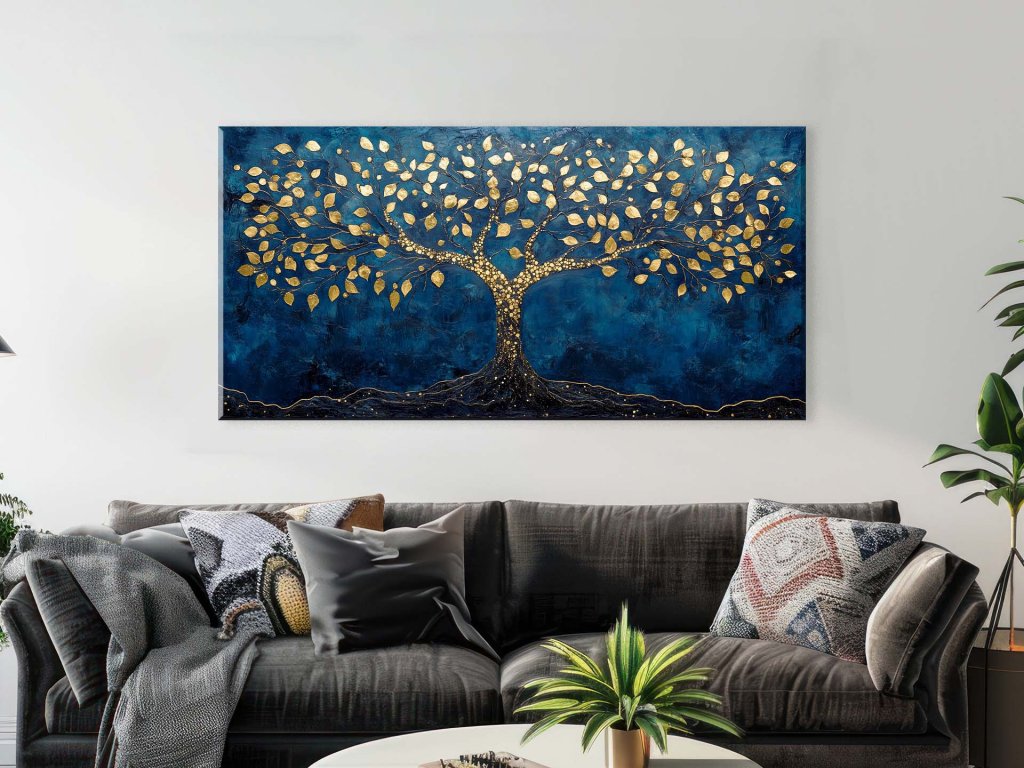 Tento obraz zachytáva strom so zlatými listami a vetvami, ktoré sa jemne rozvetvujú na všetky strany. Strom je umiestnený na sýtom tmavomodrom pozadí, ktoré zvýrazňuje kontrast medzi farbami a dodáva obrazu hĺbku. Zlaté detaily vytvárajú pocit luxusu a zároveň symbolizujú život a jeho neustály rast.