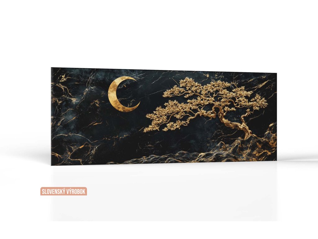 Tento obraz zobrazuje precízne spracovaný zlatý strom s jemnými detailmi konárov a listov, ktorý vyžaruje eleganciu a nadčasovosť. V popredí dominuje zlatý polmesiac, harmonicky začlenený do tmavého mramorového pozadia s náznakom zlatých pruhov. Celková atmosféra diela pôsobí majestátne a mysticky, pripomínajúc spojenie prírody s vesmírom a ich nekonečnú krásu.