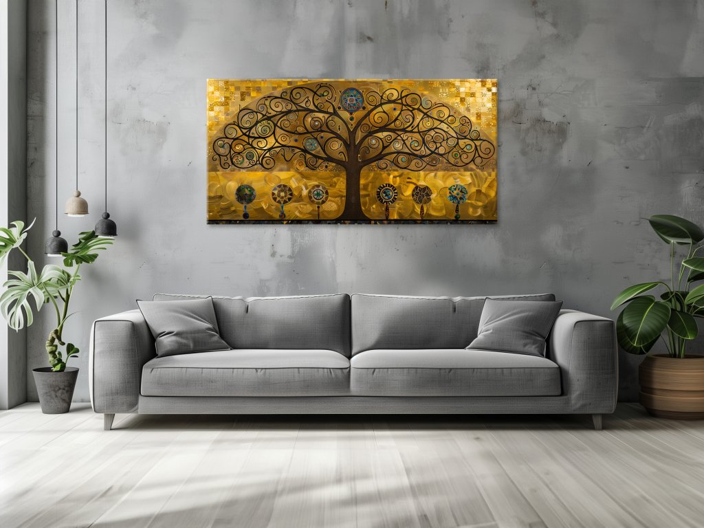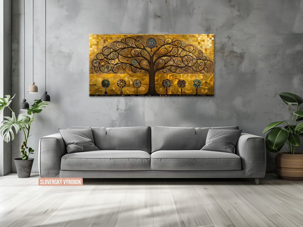 Obraz zobrazuje bohatý, ornamentálny strom v zlatých tónoch na ozdobnom pozadí.