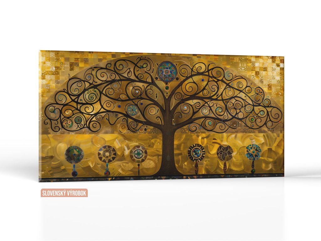 Tento obraz predstavuje nádherný ornamentálny strom života, ktorý je vyobrazený v bohatých zlatých a hnedých tónoch. Vetvy stromu sú zdobené zložitými špirálami a geometrickými vzormi, pričom celé pozadie je pokryté textúrovanými zlatými prvkami, ktoré dodávajú obrazu luxusný vzhľad. Spodná časť obrazu obsahuje menšie dekoratívne prvky, ktoré dopĺňajú celkovú kompozíciu a pridávajú obrazu hĺbku a detailnosť.