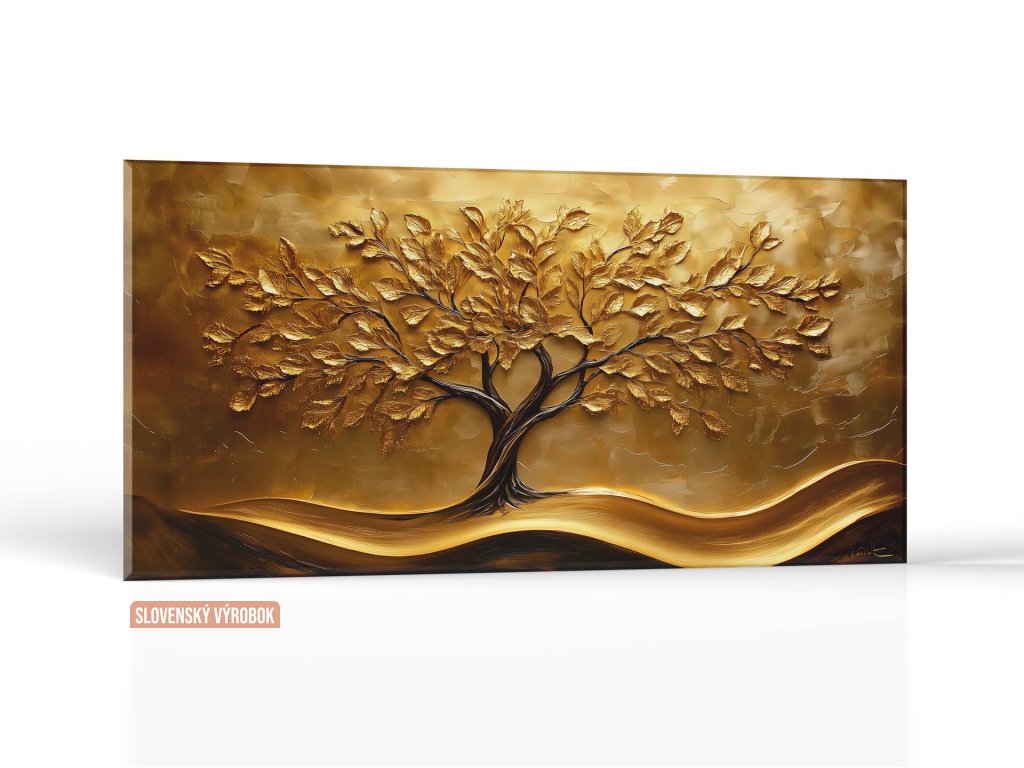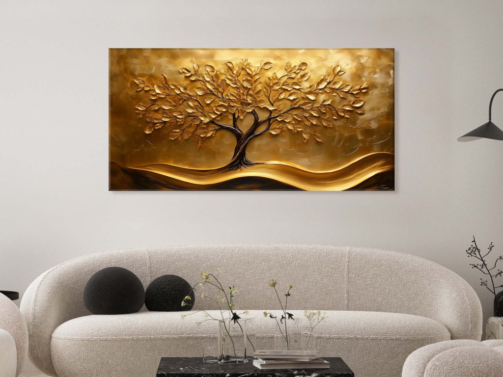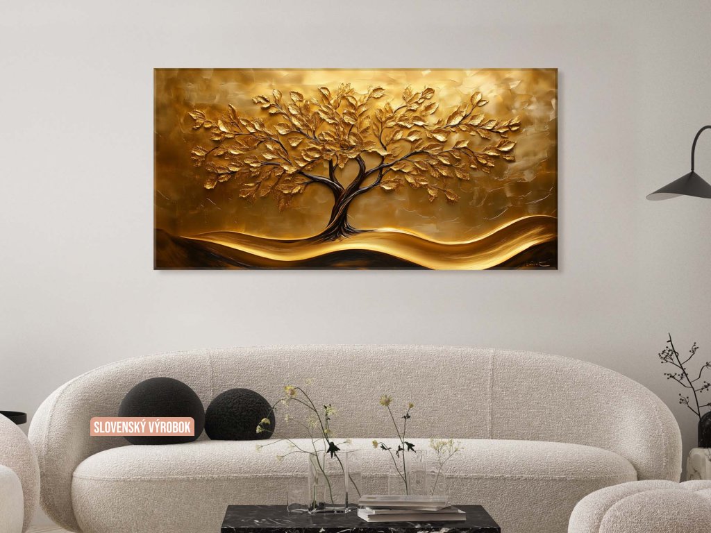Tento obraz zobrazuje harmonický strom s elegantne prepletenými vetvami, ktoré sa ako vo víre tanca rozpínajú do strán. Každý list má zlatý odtieň a pôsobí ako samostatný šperk, dodávajúc dielu luxusný a majestátny výraz. Zlatisté pozadie a mäkko plynúce línie zeme umocňujú pocit pokoja, rovnováhy a vnútornej sily.