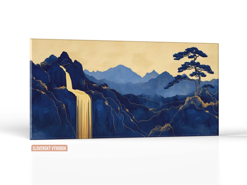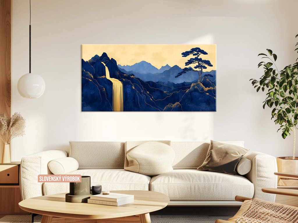 Obraz zachytáva majestátny vodopád, ktorý sa kaskádovito rúti z hôr v odtieňoch modrej, s kontrastujúcimi zlatými pruhmi pripomínajúcimi svetlo. Na vrchole skaly stojí osamelý strom, jeho vetvy sa pnú proti zlatistému pozadiu neba. Tón celej scény je jemný, poetický a vyvoláva pocit pokoja a harmónie medzi prírodou a jej tichými, mocnými prvkami.