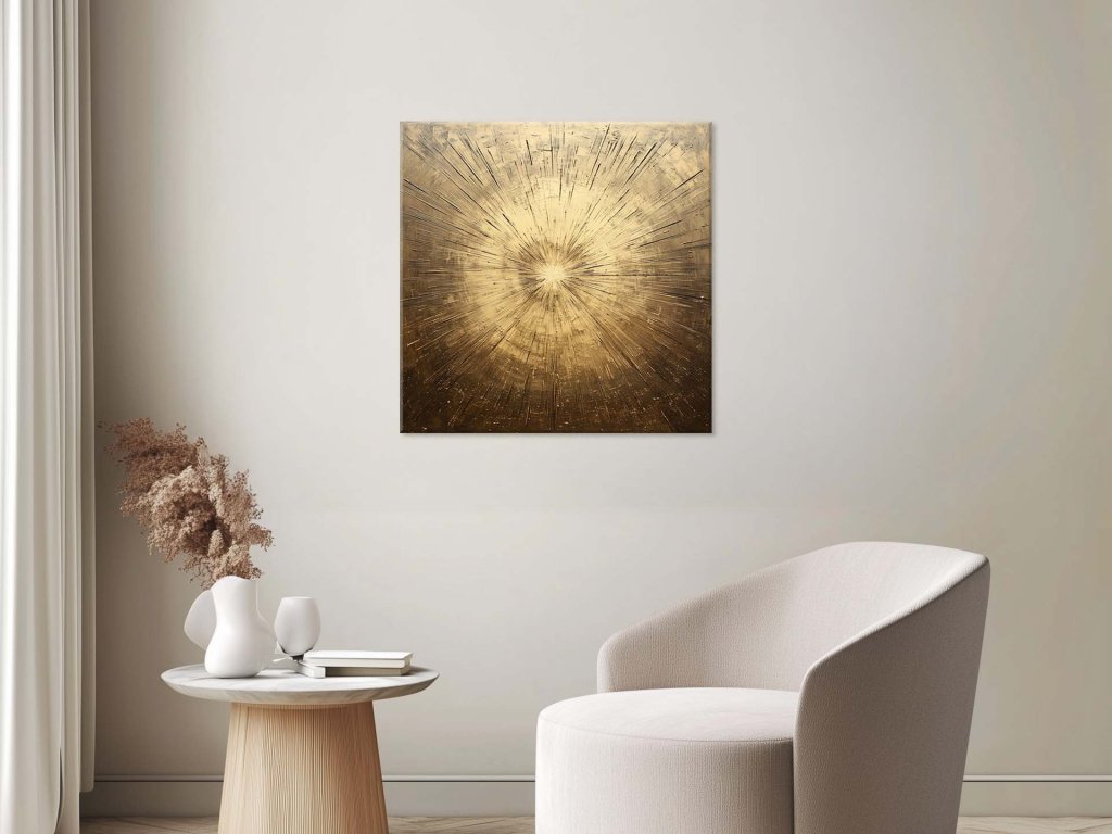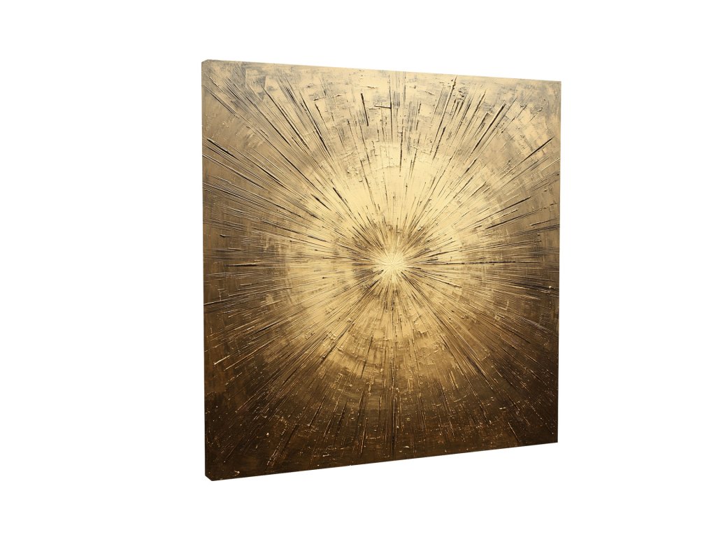 Tento obraz zachytáva dynamiku svetla, ktoré akoby vybuchlo zo stredného bodu a rozšírilo sa do všetkých smerov v podobe ostrých zlatých lúčov. Jemná textúra a detaily dodávajú dielu hĺbku a pohyb, čím evokujú energiu a vitalitu. Zlaté odtiene obrazu prinášajú luxusný a majestátny zážitok.