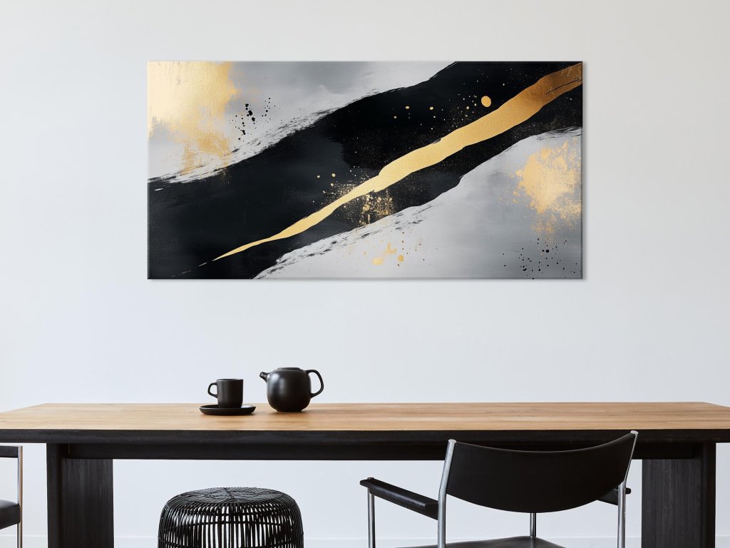 Tento obraz využíva kontrastné farby čiernej, sivej a zlatej v expresívnej abstraktnej kompozícii, ktorá pripomína filozofiu japonského kintsugi – opravy prasklín zlatom. Zlatý pás stredom plátna vyžaruje silu, eleganciu a význam obnovy, zatiaľ čo striekance a šmuhy dodávajú dielu spontánnosť. Celkový vizuál pôsobí moderne, minimalisticky a zároveň emocionálne hlboko.