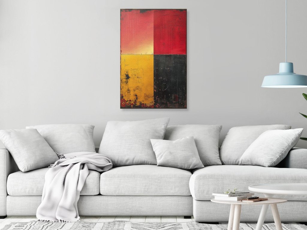 Abstraktný obraz s výraznými červenými, žltými a čiernymi blokmi.