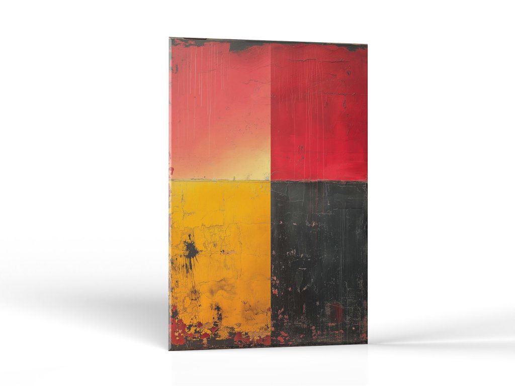Obraz predstavuje štyri vertikálne bloky, z ktorých každý má vlastnú dominujúcu farbu - červenú, ružovú, žltú a čiernu. Farby sú aplikované hrubými ťahmi, ktoré vytvárajú silný vizuálny dojem a ponúkajú pocit hĺbky a textúry. Celkový efekt je silný a jednoduchý, ale zároveň nesie v sebe určitú komplexnosť vďaka škrabancom a puklinám v pozadí.