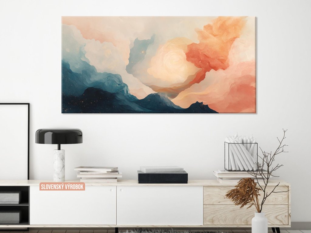 Abstraktná maľba spája nočnú hĺbku s jemným svetlom úsvitu v pastelových farbách.