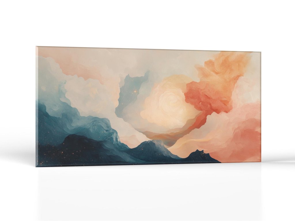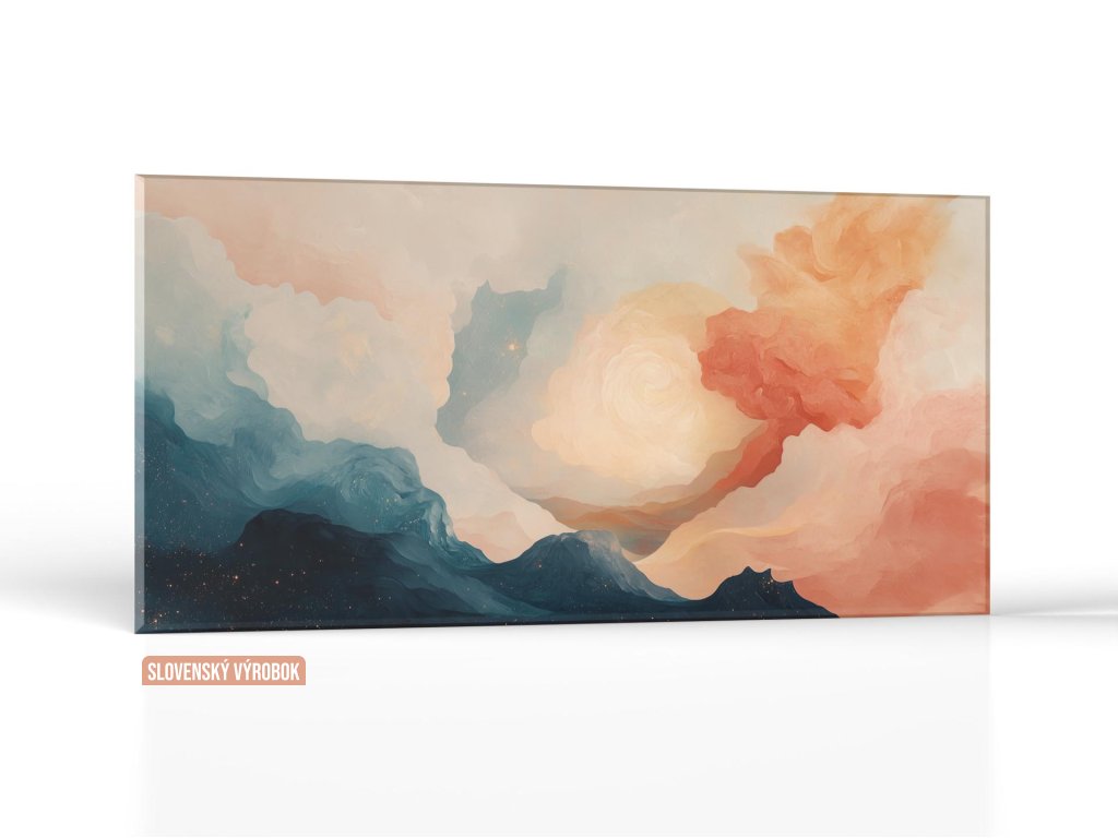 Tento obraz pôsobí ako stret dvoch svetov – temnej, hviezdami posiatej modrej hlbiny a svetlých oblakov žiariacich v teplých odtieňoch úsvitu. V strede kompozície víri svetelný stred, ktorý pripomína slnečné jadro alebo energetické centrum. Celá scéna pôsobí mysticky a meditatívne, s jemným prechodom medzi pokojom noci a prísľubom nového dňa.