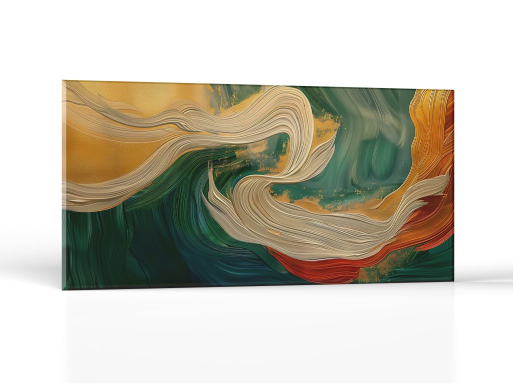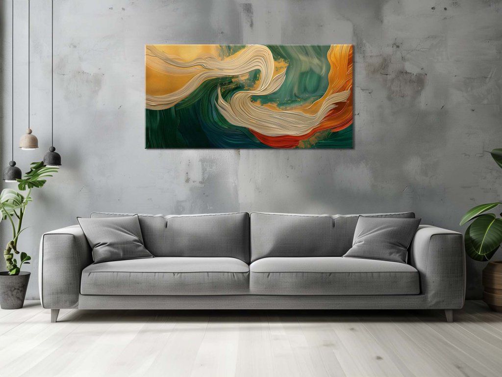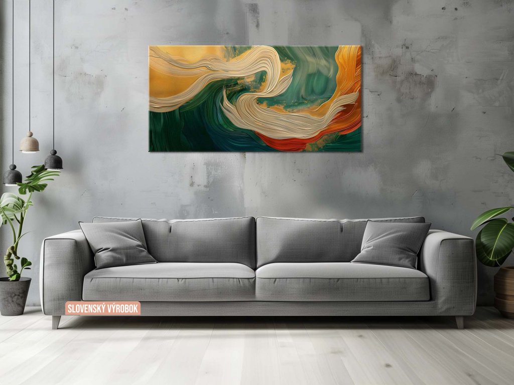 Obraz predstavuje zložité zvlnené línie, ktoré sa preplietajú v bohatom spektre zelených, zlatých a oranžových tónov. Táto kompozícia pripomína pohyb a rytmus prirodzeného prostredia, ako sú vlny oceánu alebo pohyby vzduchu. Zlaté akcenty na obraze dodávajú luxusný a elegantný efekt, ktorý zvyšuje vizuálnu hĺbku a textúru.