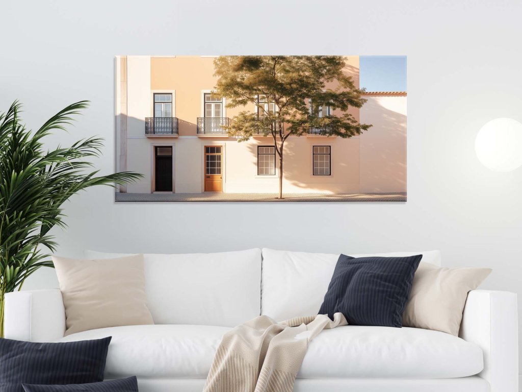 Tento obraz zachytáva pokojné mestské prostredie s nádhernou fasádou historickej budovy, ktorej pastelové tóny odrážajú teplo slnečného svetla. Strom v popredí vrhá jemné tiene na chodník a fasádu, čím dodáva obrazu prirodzenú harmóniu a rovnováhu. Detailne spracované balkóny s kovanými zábradliami a veľké okná dotvárajú atmosféru elegantného mestského bývania.