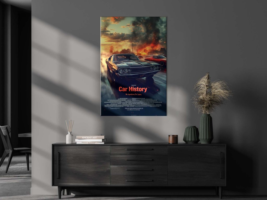 Tento obraz zachytáva dynamickú a nostalgickú atmosféru historických muscle cars, ktoré sú symbolom sily a rýchlosti. Na pozadí horiaceho slnka a dymu sa tieto vozidlá vynímajú ako skutočné legendy automobilového priemyslu. Scéna vyžaruje napätie a vzrušenie, pripomínajúc súboje na cestách a tradíciu rýchlej jazdy.
