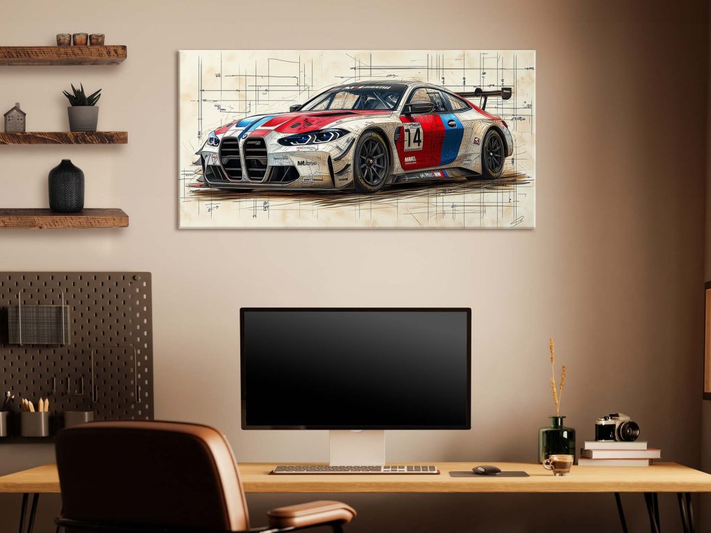 Tento obraz zobrazuje športové závodné auto v atraktívnej farebnej kombinácii červenej, bielej a modrej, ktoré je navrhnuté s dôrazom na detail a precíznosť. Pozadie tvorí množstvo technických nákresov a schém, ktoré ilustrujú konštrukčné prvky a precíznu inžiniersku prácu. Obraz zdôrazňuje spojenie medzi umením automobilového dizajnu a technickými vedomosťami, ktoré sú nevyhnutné pre vysokovýkonné závodné stroje.