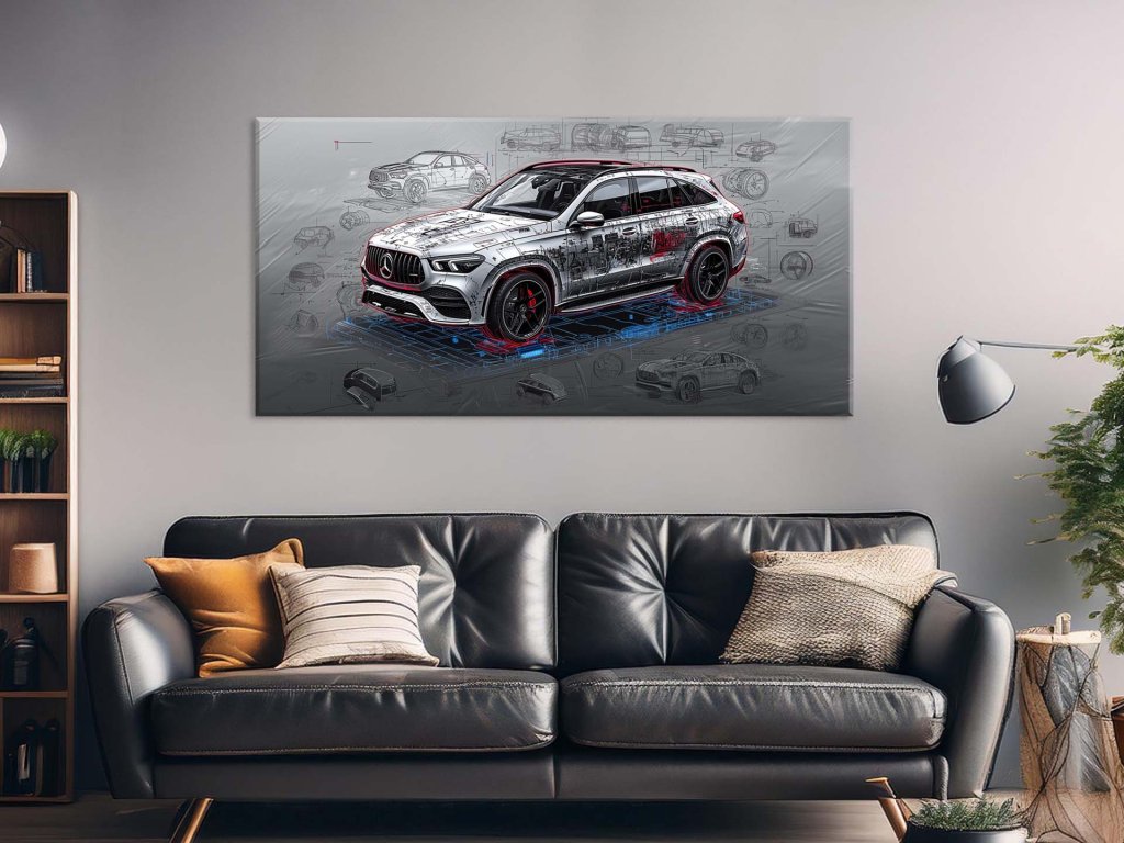 Tento obraz zachytáva futuristické SUV vozidlo s detailmi jeho technickej štruktúry a vnútorných systémov. Dizajn kombinuje realistické vykreslenie vozidla s vrstvenými schémami, ktoré zdôrazňujú technologické inovácie a prepojenie komponentov. Na pozadí sú náčrty a nákresy, ktoré zdôrazňujú proces tvorby a vývoj moderného automobilu.