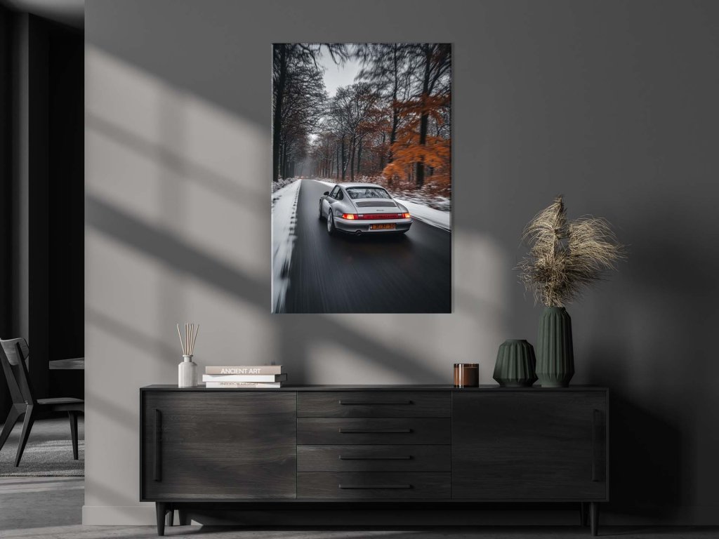 Tento obraz zachytáva ikonické Porsche 911 pri dynamickej jazde zimnou krajinou. Cesta je lemovaná stromami, pokrytými jemnou vrstvou snehu, pričom kontrastné oranžové lístie dodáva scéne teplé odtiene. Auto, so svojou nadčasovou eleganciou, zosobňuje radosť z jazdy a spojenie človeka so strojom aj v chladnom období.