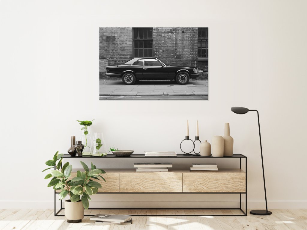 Na obraze vidíme čierny Mercedes-Benz z boku, ktorý stojí pred tehlovou budovou. Automobil svojou elegantnou a nadčasovou siluetou odráža atmosféru minulých dekád, pričom zachováva svoju ikonickú prítomnosť. Tehlová stena v pozadí pridáva scéne industriálny a nostalgický nádych, čím zvýrazňuje kontrast medzi luxusom vozidla a surovosťou prostredia.