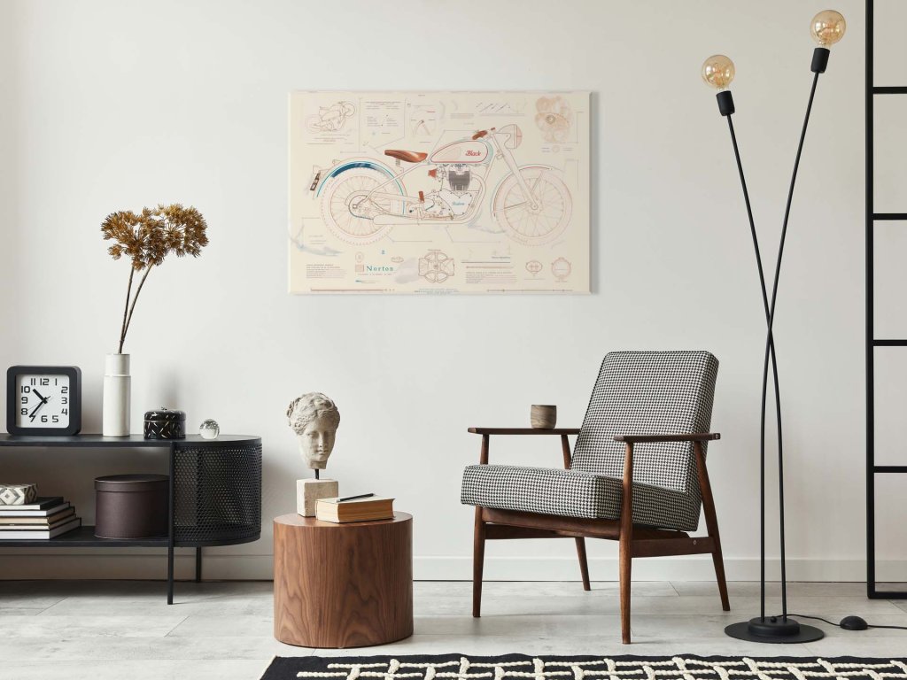 Tento obraz zobrazuje detailnú technickú schému motocykla Norton Black. Ilustrácia zobrazuje jednotlivé komponenty a technické aspekty motocykla, vrátane motora, rámu a ďalších častí. Obraz má retro estetiku a je ladený do jemných pastelových farieb, ktoré dodávajú ilustrácii historický a klasický vzhľad.