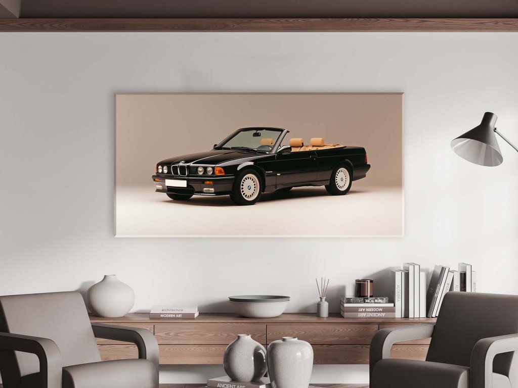 Na obraze vidíme elegantný čierny kabriolet s béžovým koženým interiérom, ktorý vyniká svojou klasickou krásou a nadčasovým dizajnom. Tento model je ideálny na letné jazdy, kedy si môžete užívať vietor vo vlasoch. Automobil vyžaruje štýl a sofistikovanosť, a zároveň pozýva na dobrodružné cesty pod šírym nebom.