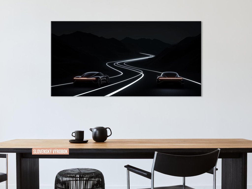 Obraz zobrazuje dynamickú scénu dvoch moderných áut uháňajúcich po kľukatej ceste, ktorej línie žiaria v kontraste s tmavými siluetami hôr. Minimalistická kompozícia zdôrazňuje pohyb, rýchlosť a technologickú eleganciu. Svetlá ciest a zadných svetiel áut vytvárajú futuristickú atmosféru plnú napätia a ticha noci.