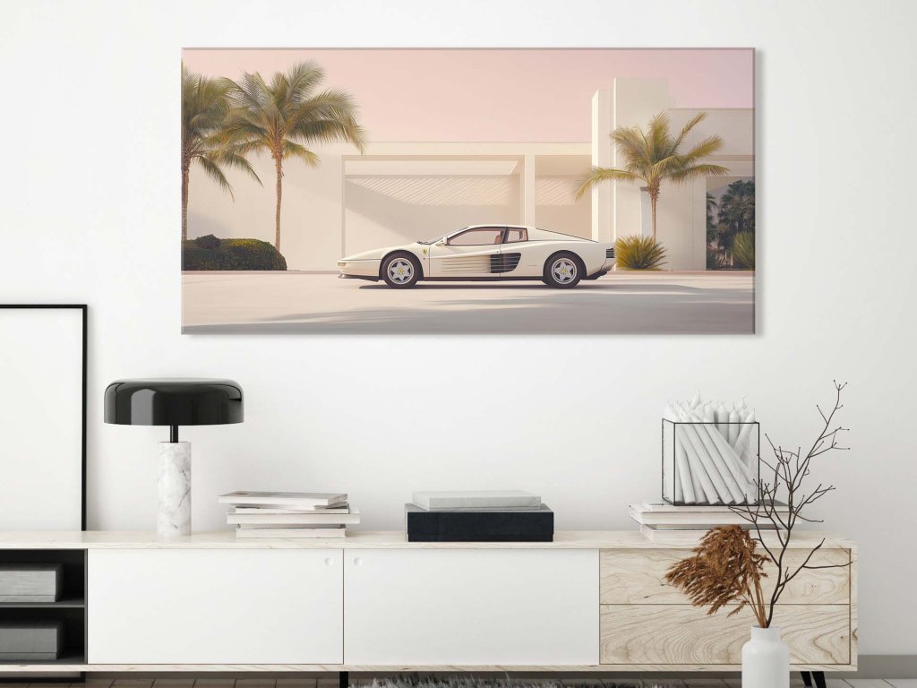 V obraze dominuje elegantné biele Ferrari Testarossa, zaparkované pred minimalistickou bielou vilou v luxusnom prostredí Palm Springs. Palmy vytvárajú tropickú kulisu, zatiaľ čo jemné ranné svetlo zvýrazňuje čisté línie architektúry aj vozidla. Atmosféra pôsobí ticho a pokojne, akoby čas na chvíľu zastal v tomto slnečnom kúsku raja.