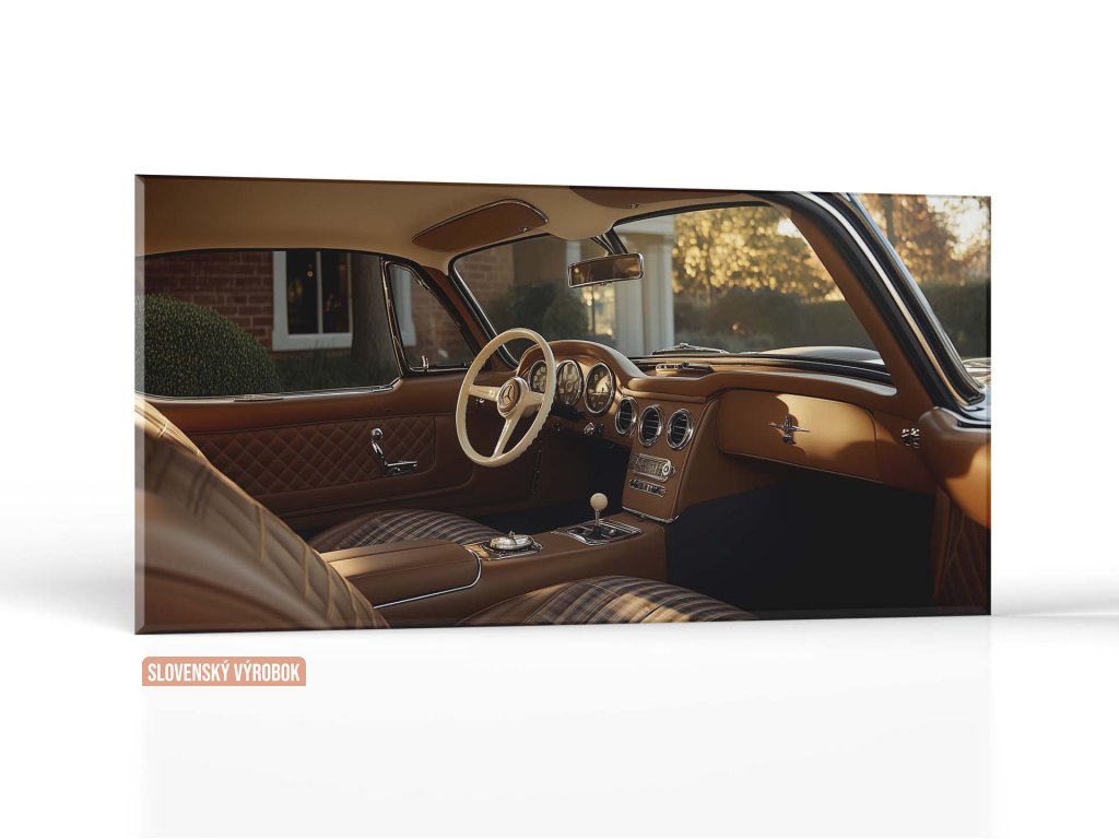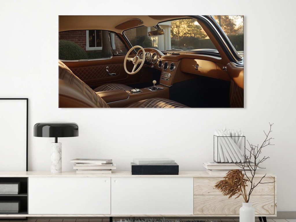 Tento obraz zachytáva interiér historického automobilu v dokonalej rovnováhe medzi retro šarmom a luxusom. Kvalitná hnedá koža, prešívanie a chrómové prvky dodávajú priestoru noblesu a jedinečný charakter. Atmosféru dopĺňa jemné svetlo, ktoré preniká dnu a podčiarkuje krásu každého detailu.