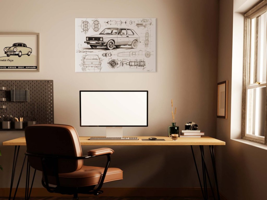 Tento obraz zobrazuje detailné technické výkresy a návrh klasického retro auta VW Golf. Vozidlo je zobrazené z rôznych uhlov, doplnené o technické detaily ako sú výkresy kolies, podvozku a ďalších mechanických častí. Náčrty a technické špecifikácie zdôrazňujú precízny dizajnový proces a technickú zručnosť potrebnú na vytvorenie tohto klasického automobilu.